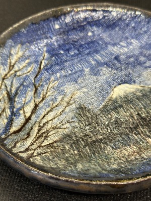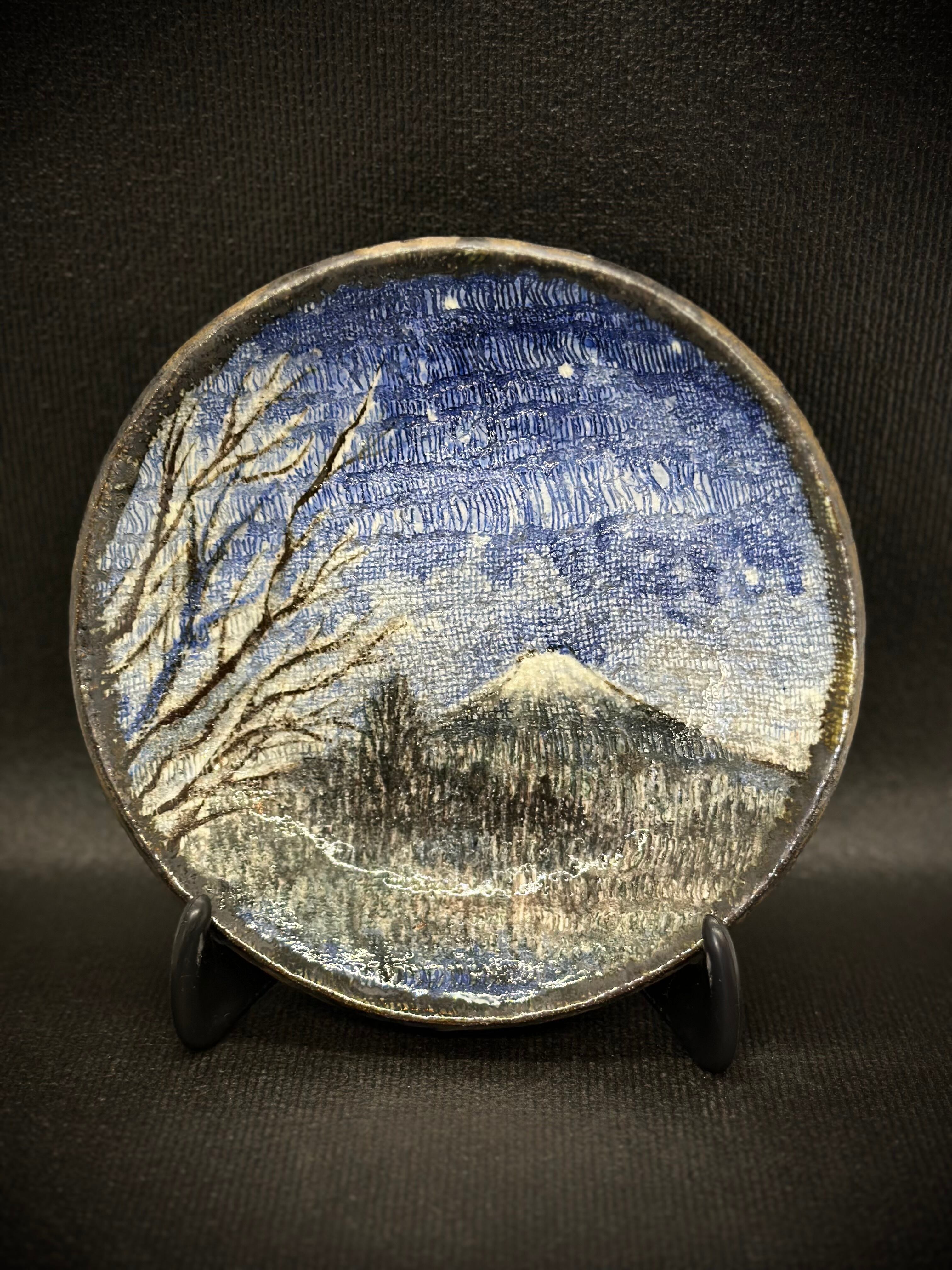 星たちは見守る中 心静かに 呼吸する ●作品名 : 【夜の富士】絵皿 ●作家名 : 西美紀 Miki Nishi ●技法 : 陶芸 ●サイズ :直径Φ約15.5㎝ ●材質・素材:陶器(唐津土)・化粧土・下絵の具(下絵付け)・オリジナル透明釉・色釉薬 ●焼き物なので、一生色褪せることがありません。大切に使っていただければ、時を超えてあなたと共に寄り添います。 ●手作り・手描き・一点もの ●食器としてお使いいただけます。 ⚠︎食洗機不可 優しく手洗い ✴︎皿立て付き 2024