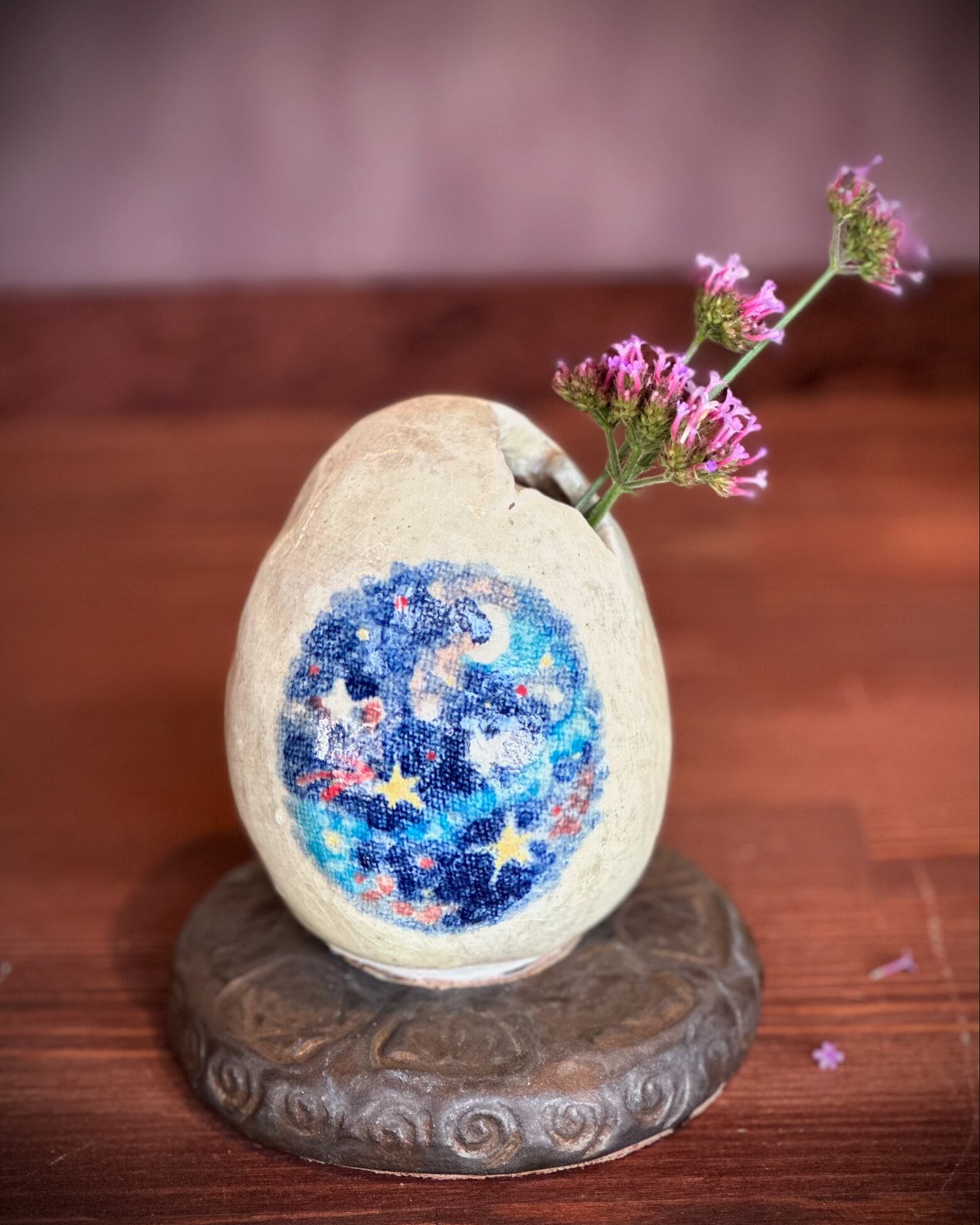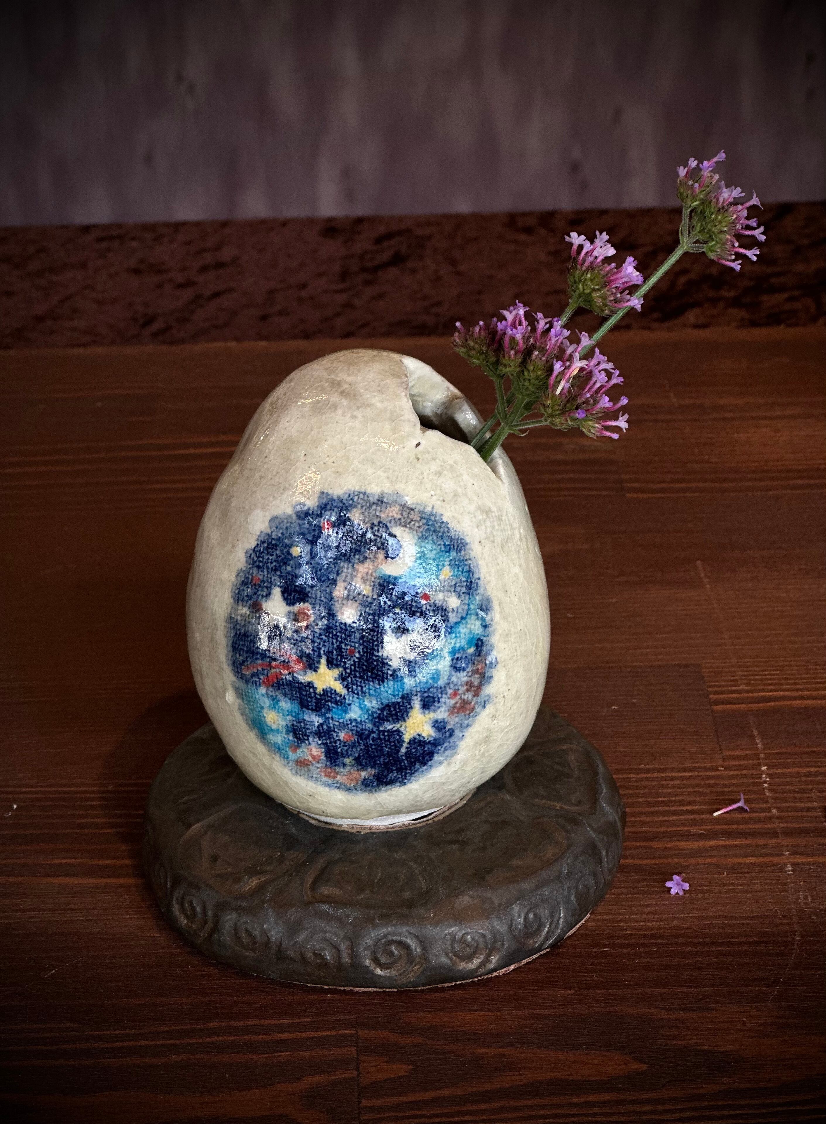 卵の中に宇宙 殻は破れる そこからは 花が咲くだろう。 宇宙卵に花や葉を生けられます。 上下、卵と台で離れます。 素材・卵:陶土、下絵の具、オリジナル透明釉、 台:陶土、色釉薬 サイズ・㎝ ※光や場所により、写真に写る色が変わります。